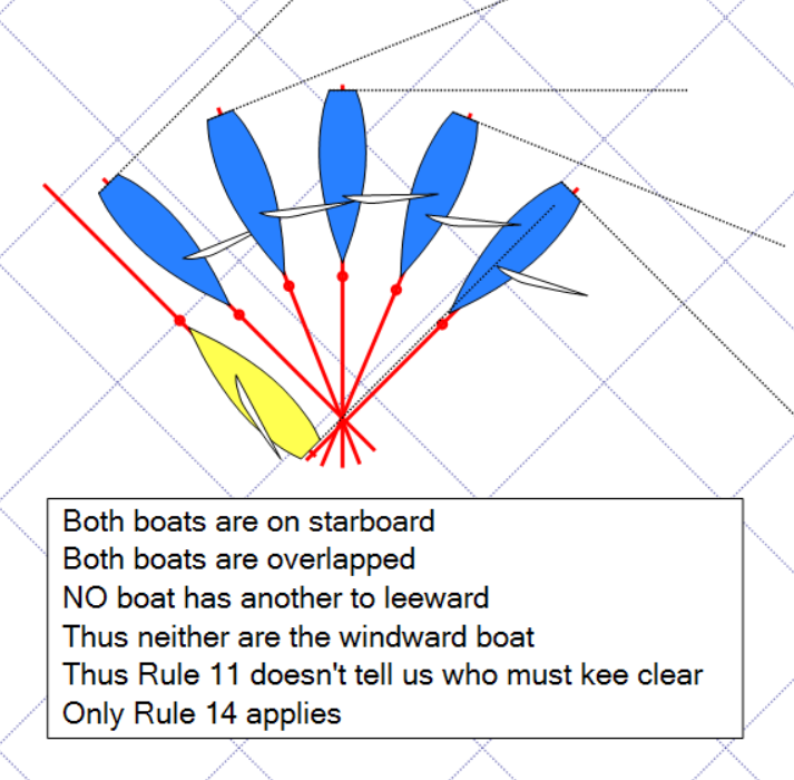 What should strike you as surprising is that at least the right 4 possibilities for Blue are not at all uncommon (the leftmost Blue boat is significantly by the lee. Not something displacement boats do that often, but Lasers and other dinghies certainly do). Picture a windward mark where some boats have rounded and are heading downwind (Blue) and others are still sailing to windward towards the mark (Yellow). I've been in this situation a hundred times if not more.