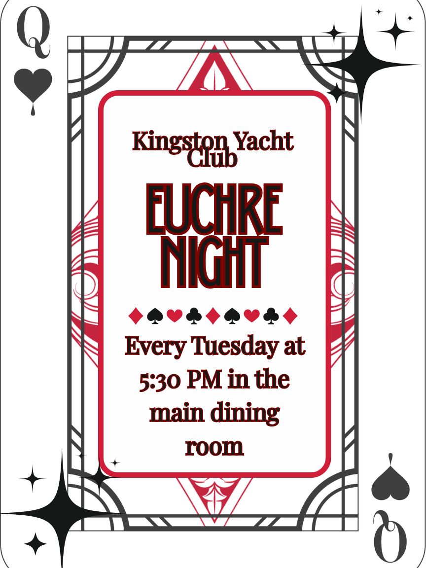 All are welcome to our Tuesday Euchre Tournament Nights, and please feel free to invite guests that you think would like to join in some good clean card fun. We start playing at 5:30 on Tuesday but come earlier for pre-refreshments or arrive later if that suits your schedule, we are flexible and will find a spot for one and all! |