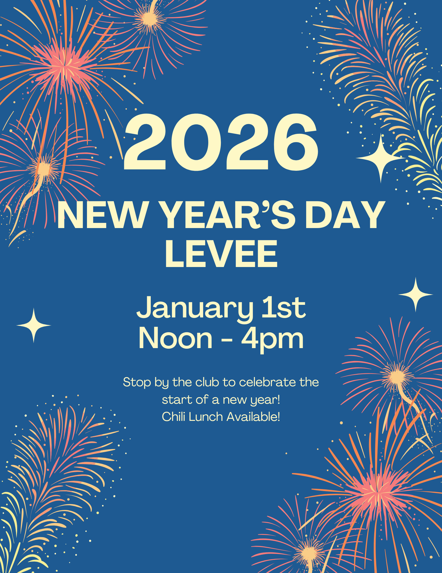 Join your friends at the club to ring in the new year. Chili lunch will be available.